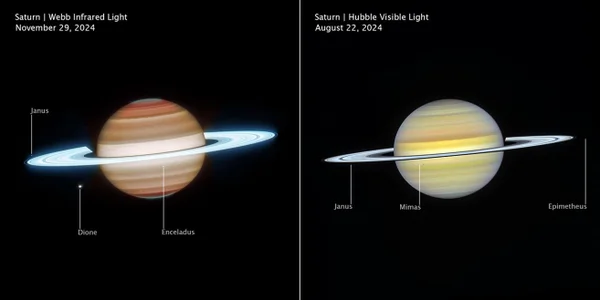 New images captured by the Hubble and James Webb space telescopes show Saturn in both visible and infrared light
